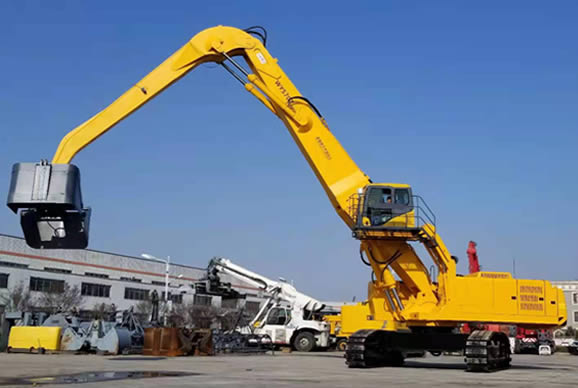 該設(shè)備分別采用了大功率“國(guó)三”標(biāo)準(zhǔn)發(fā)動(dòng)機(jī)、380V 西門子電機(jī),以及全套采用施耐德控制系統(tǒng)拖動(dòng)控制兩套力士樂(lè)液壓動(dòng)力機(jī)構(gòu)及先導(dǎo)液力控制的世界首臺(tái)“雙動(dòng)力”抓料機(jī)。該機(jī)設(shè)計(jì)了寬體結(jié)構(gòu)梁,以及加強(qiáng)型可更換正、負(fù)差的二節(jié)式作業(yè)主臂,最大吊重量達(dá) 25 噸、最大作業(yè)半徑為 18米。在 5 至 12 米作業(yè)半徑內(nèi),可配備 5.0 立方蚌殼抓斗,或 2.5 立方梅花廢鋼抓斗。